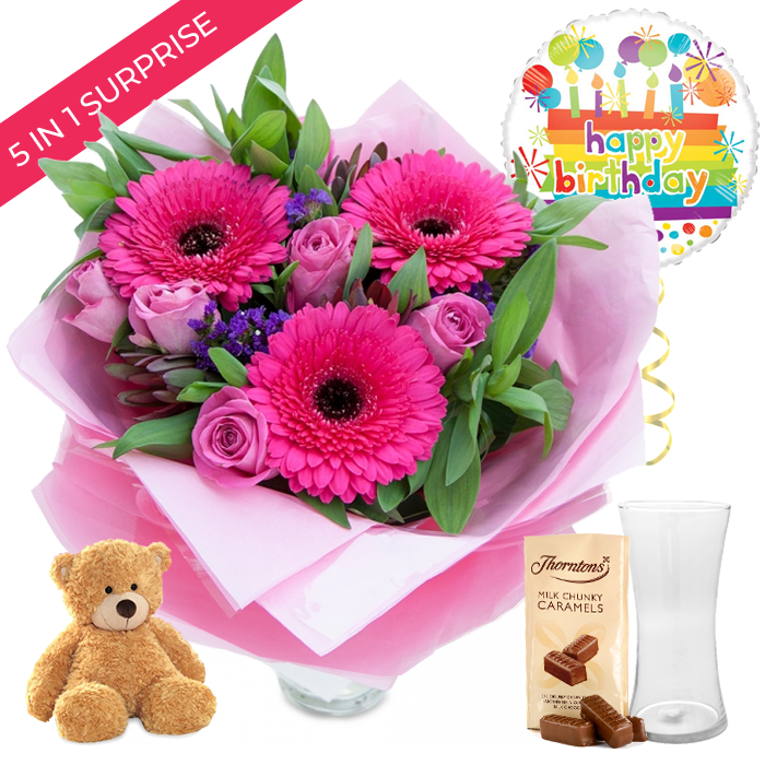 We can give you the best gift idea to add vibrancy & joy to their b-day! This 5 in 1 gift set includes our magnificent Sorbet bouquet, a cuddly teddy bear, a festive "Happy Birthday" balloon, a luxurius glass vase and some delicious chocolate candies - a truly original way to express your very best birthday wishes!